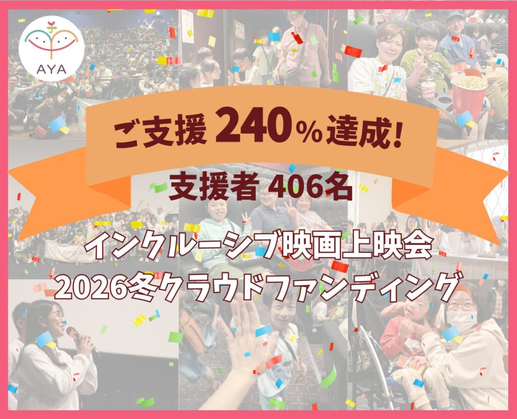 挑戦中の「全国の病気や障がいのある子どもたちに安心して楽しめる映画上映会を届けたい!あと3県で全国47都道府県達成!」のクラウドファンディングは、皆さまの温かいご支援により目標金額を大幅に上回る2,410,000円、支援者数406名で終了いたしました。