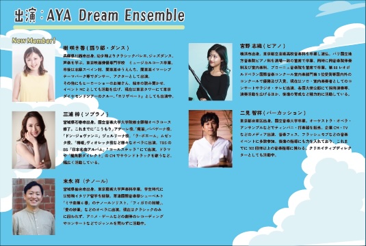 | 出演 | AYA Dream Ensemble 歌のおにいさん:末永 祥 歌のおねえさん:三浦 梓 ピアノ:宮野 志織 パーカッション:二見 智祥 語り部・ダンス:樹 咲き香 |
