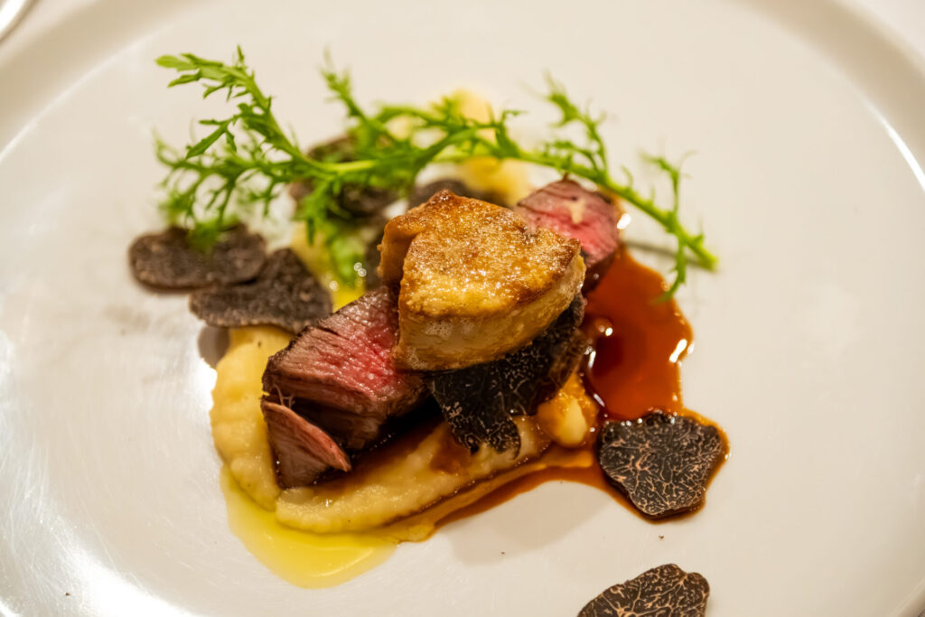 すぐそばで響く楽器の音に包まれる中、前菜から配膳が始まり、フルコース料理を堪能しました。