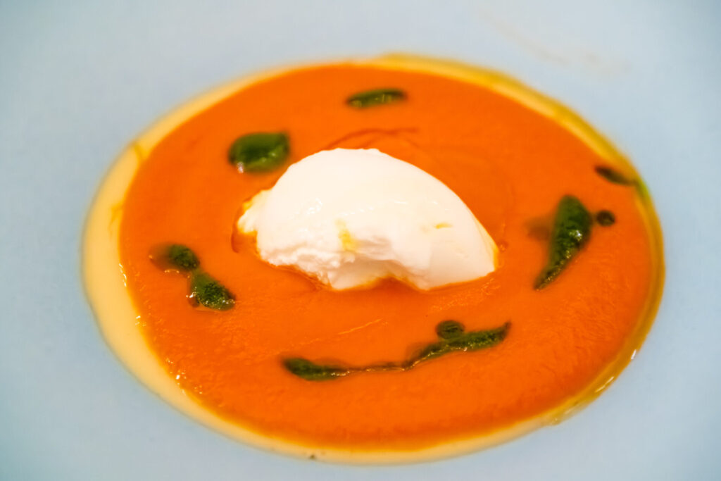 ペースト食の感想:オマール海老はエビの風味たっぷり、ふわふわ、バジルソースとの相性がバッチリ、えびを感じました。食感が違っていて面白く、ペーストだけど、全て混ぜているのではなく、少しずつ別のお皿で出てくるので味に変化があって楽しかったです。
