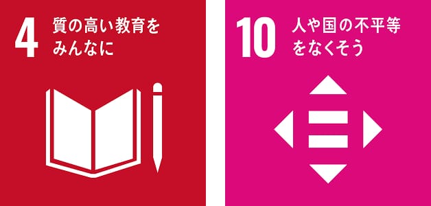 SDGsのゴール、4番(質の高い教育をみんなに)、10番(人や国の不平等をなくそう)に対して、AYAは病気や障がいのある子どもたちへのスポーツ、芸術、文化を通じた活動支援に取り組むことで、これらの子どもたちが直面する教育の機会不足、社会的な不平等の課題解決を目指します。