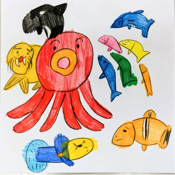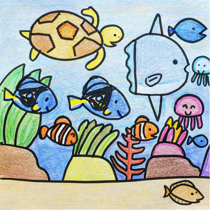 ●作品への想い 海の生き物は何かを考えて書きました。 タコやラッコ、サメ、シャチ、魚、カクレクマノミ、セイウチを書きました。 生き物が大好きです。 ●審査員・なるかわしんごさんのコメント いきものが好きな気持ちが、絵からすぐに伝わってきました。特徴をよくとらえながら、自分なりの感覚や工夫がしっかりと表現されていますね。これからも「好き」を大切に、のびのびと描き続けてください。素晴らしい表現に大きな拍手を送ります。 |