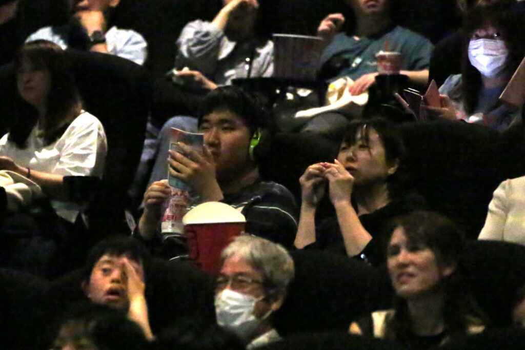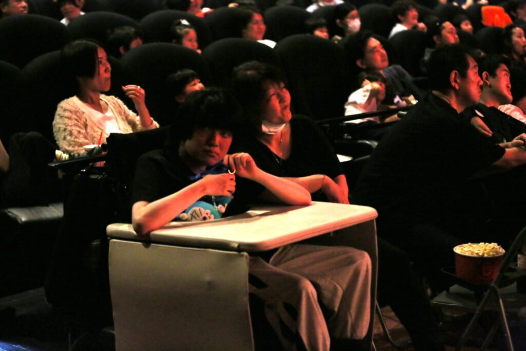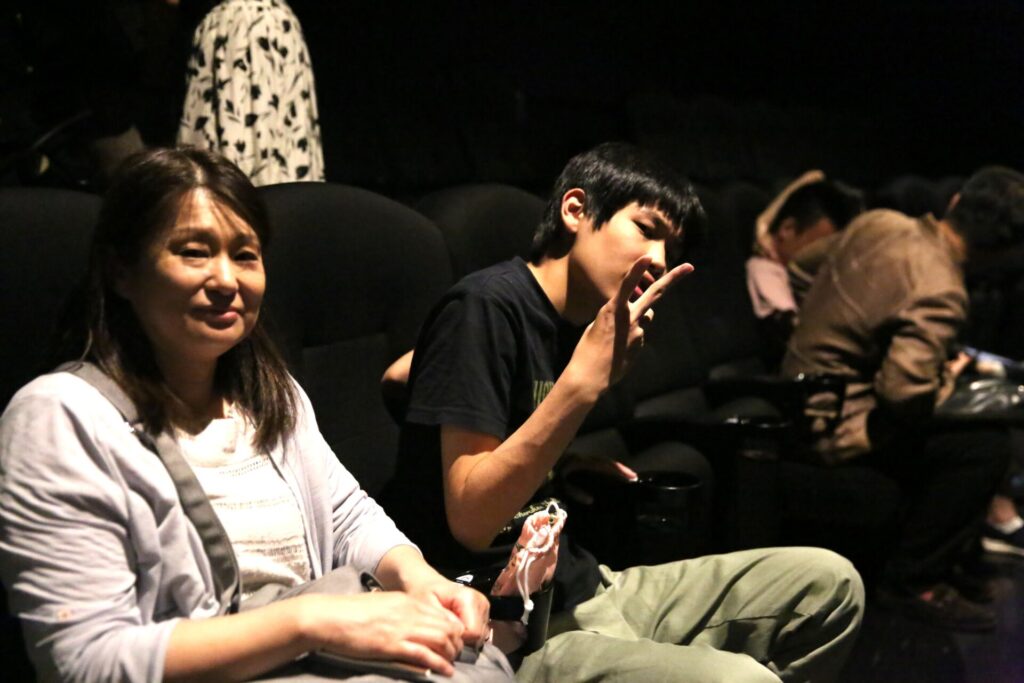 映画上映中は集中して映画を見ているのかシーンとする場面もあれば、笑いが起こったり、怖いシーンではざわざわしたり。途中で外に一旦出てみたり、座席の近くで立って観たり。