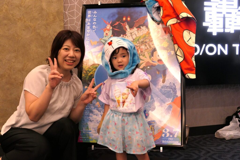 看板前で写真を撮るご家族は、ドラえもん帽子やタイム風呂敷を模したタオルなど可愛いグッズを持参していました!今日という日を満喫している様子が見られて、スタッフも思わず笑みがこぼれてしまいました😊