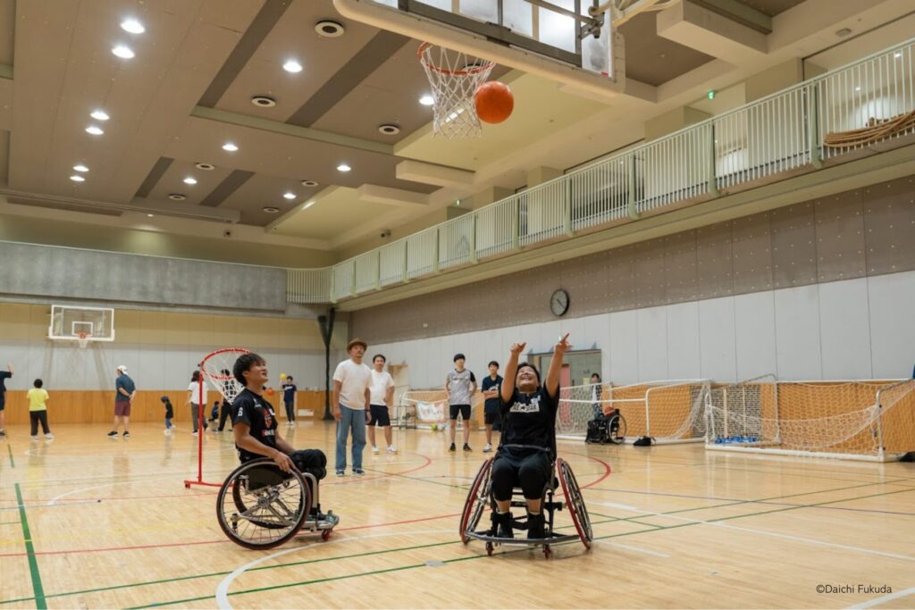 車椅子に乗って、ゴールに向かってシュート!通常のバスケとの感覚の違いが新鮮でした。