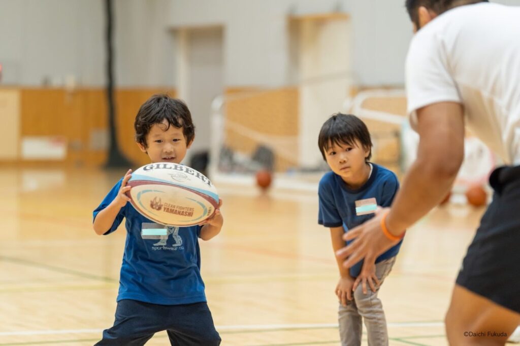 それぞれの選手チームに分かれてゲームをしながらパス、トライ、キャッチを体験!ラグビーは激しいスポーツですが、選手の皆様は子ども達のペースに合わせた指導を行っていただきました。