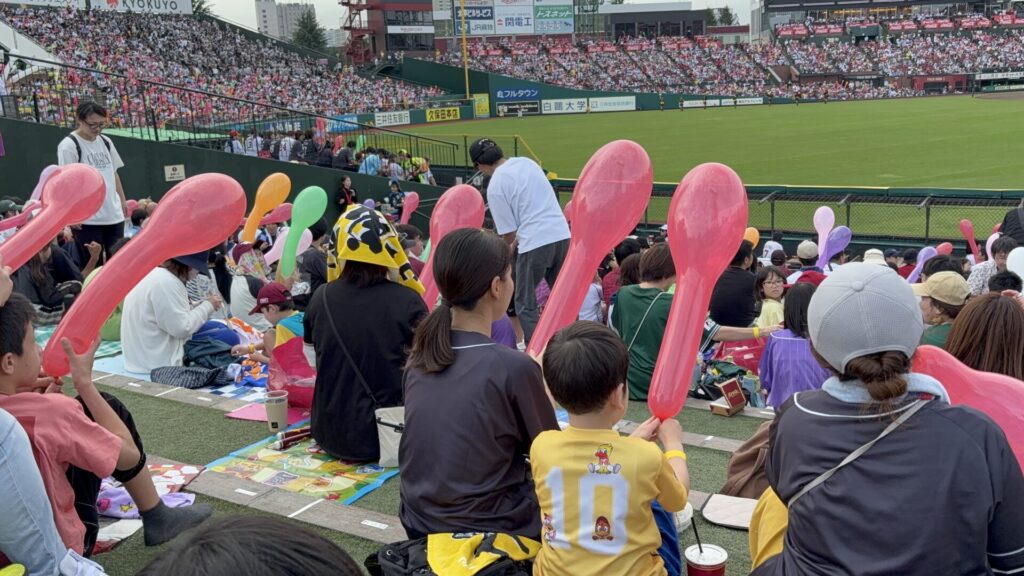 その後、ラッキー7にはジェット風船を皆で飛ばすパフォーマンスが。一生懸命膨らませた色とりどりの風船が飛んでいく様子に、子ども達もとても喜んでいた様子でした!