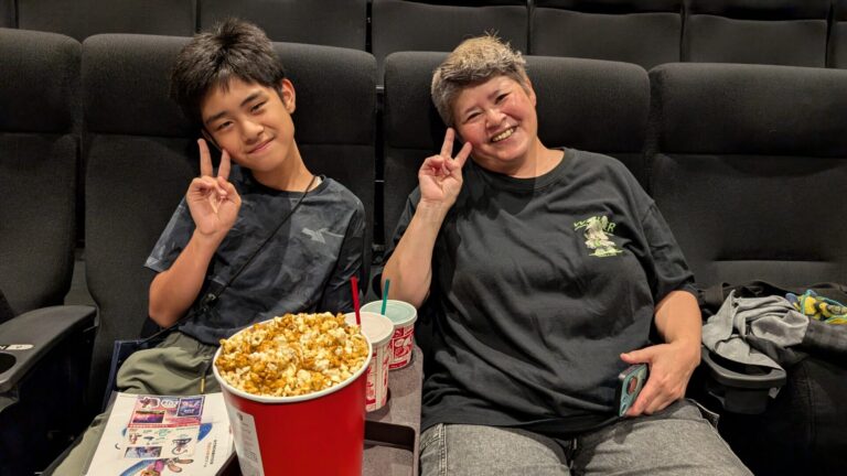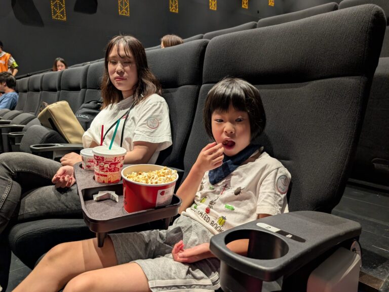 映画上映までは、ポップコーンを頬張ったり、ジュースを嬉しそうに飲んだりしながら、映画館の雰囲気をたっぷり味わってくれていました。