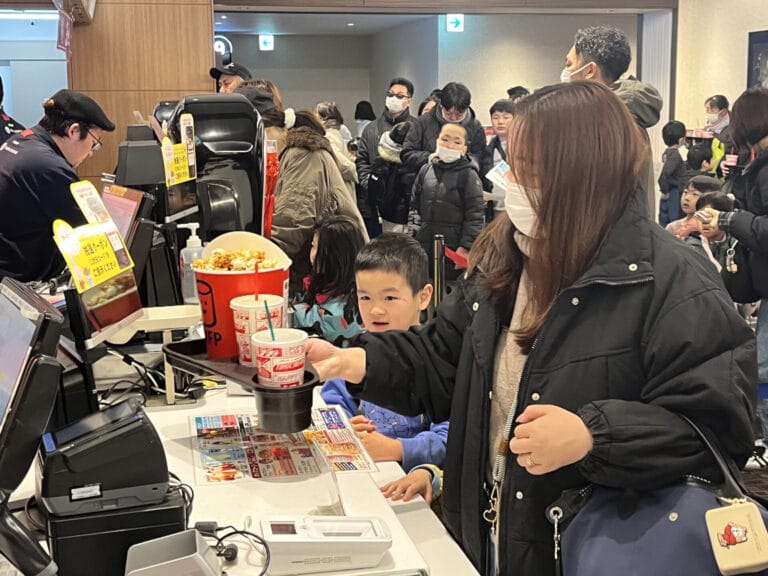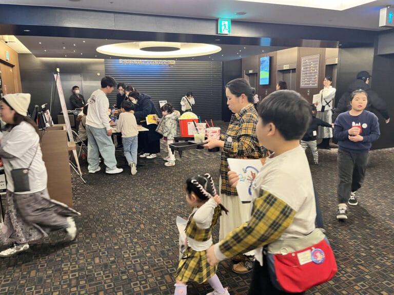 TOHOシネマズ 錦糸町楽天地のロビーに設けられたAYA特設受付には、朝早くから参加者が続々と集まり、活気に溢れていました。フロアにある売店では開場前に到着されたご家族から順次ポップコーンや飲み物を購入されており、開場とともに子ども達は嬉しそうにポップコーン片手に入場していました。