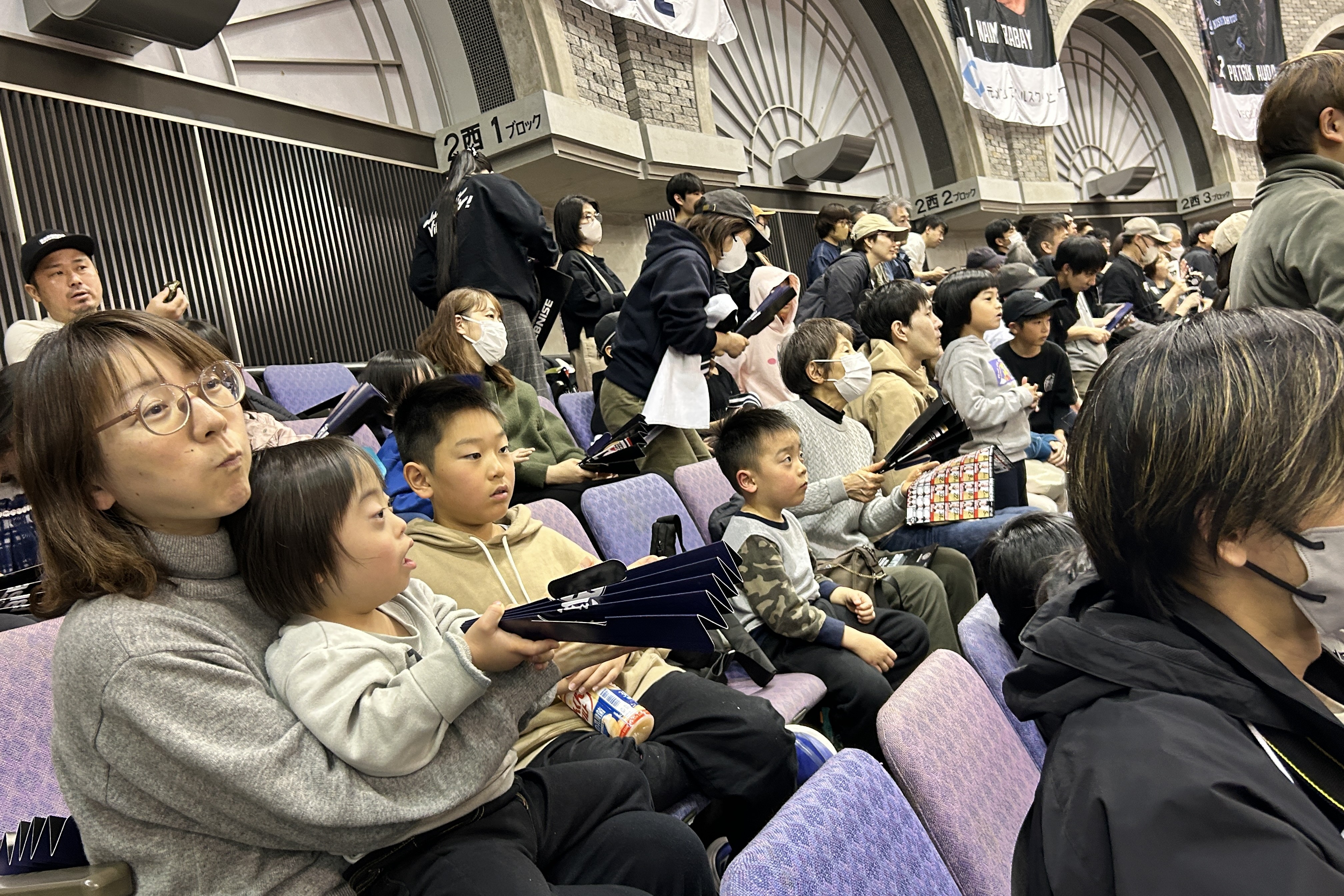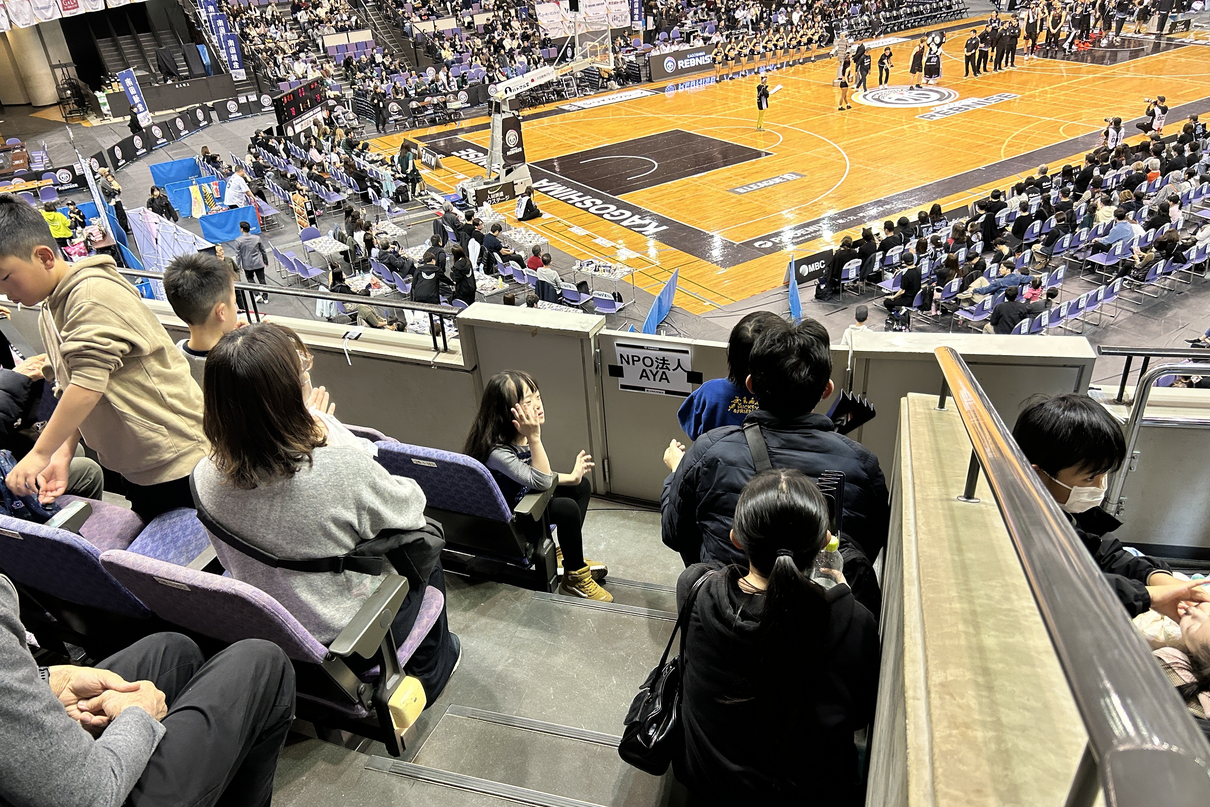 初めてバスケットボール観戦を体験するお子さんも多く、大きな歓声や音響、スピード感のあるプレーに最初は少し驚いた様子も見られましたが、次第に会場の雰囲気に慣れ、試合の展開に目を向けながら観戦を楽しんでいました。