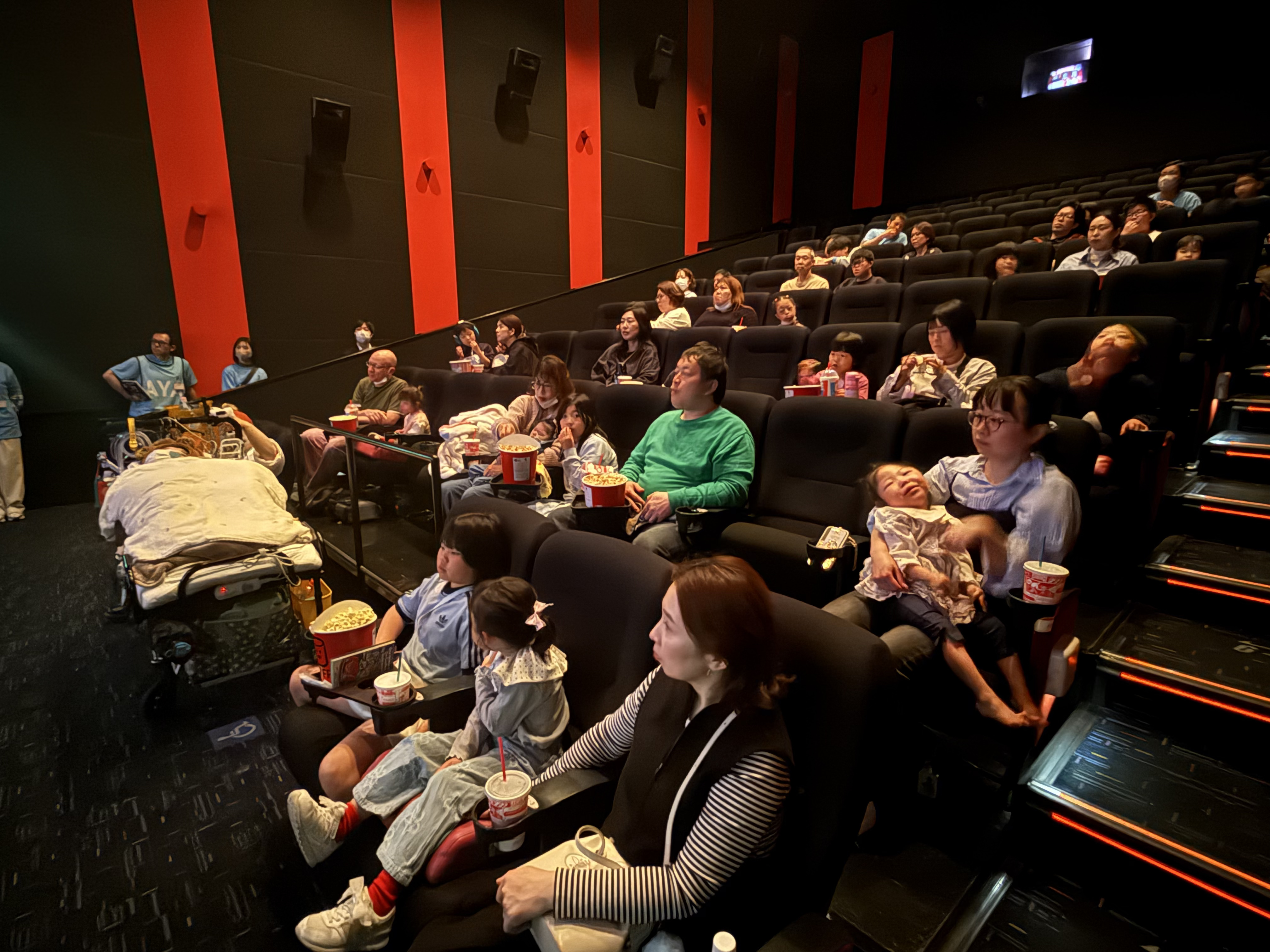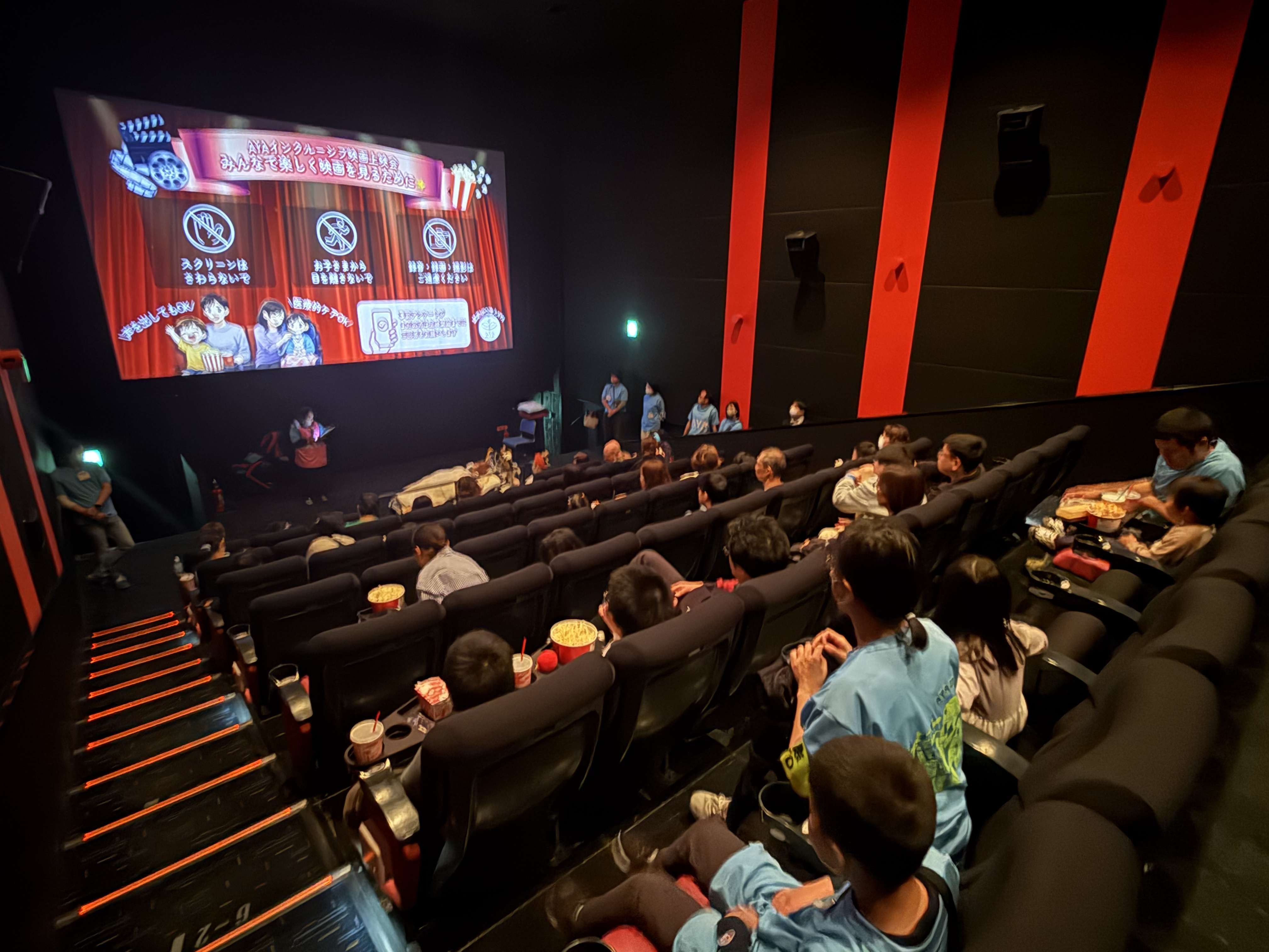 劇場内では、ポップコーンを食べながらそれぞれの席で上映開始を待つ中、保護者の方と一緒に過ごすお子さんや、落ち着いて座って待つ姿も見られました。