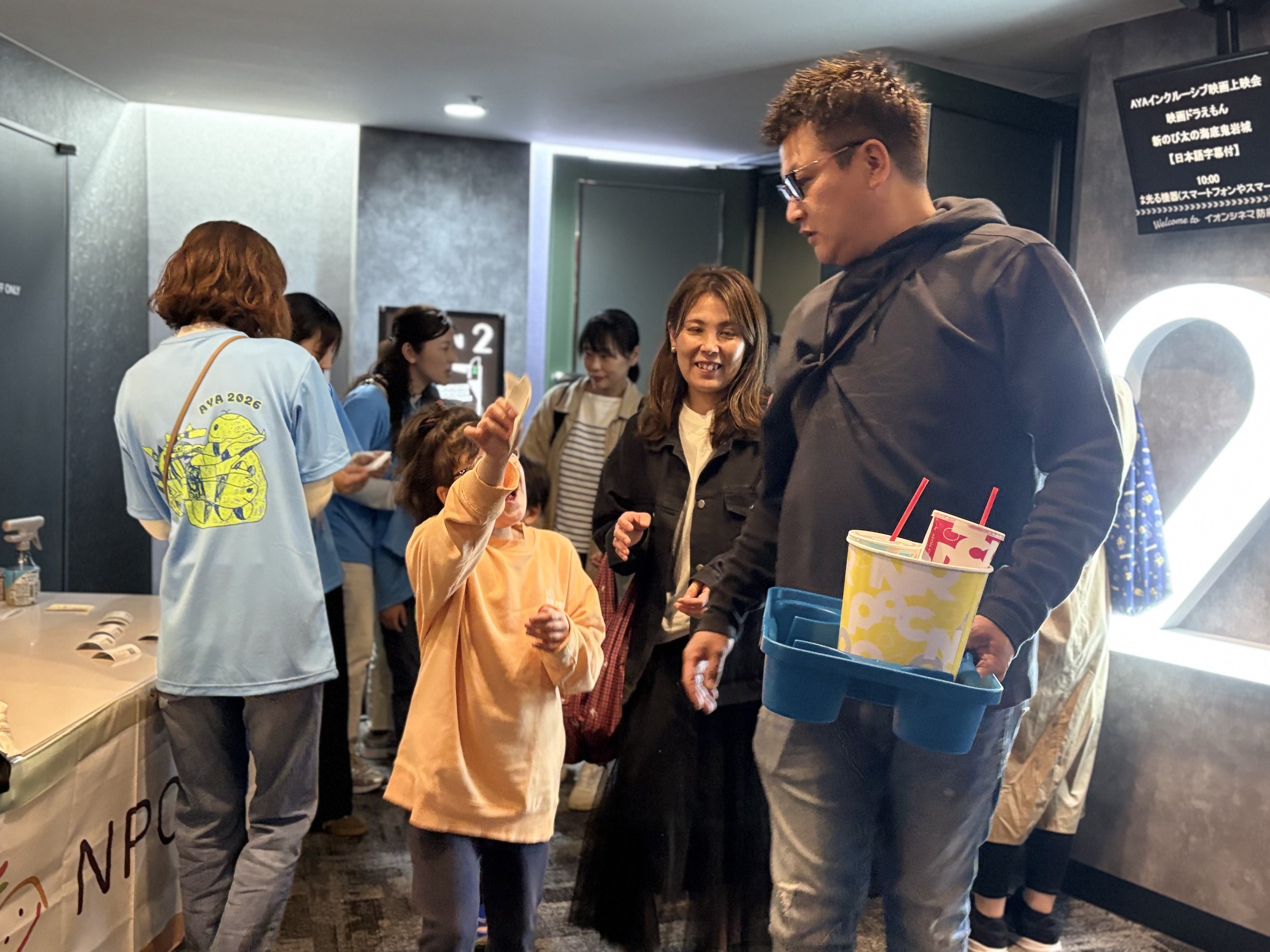 イオンシネマ防府には、受付開始前から、インクルーシブ映画上映会を楽しみに待ってくださっている方々の姿が!
